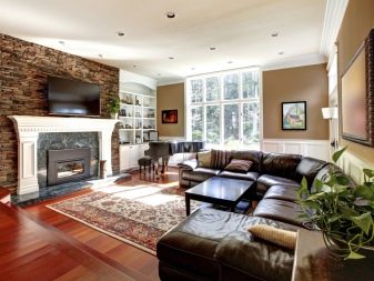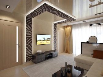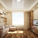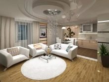 - Design podlahy a stropu. Pro obývací pokoj v kuchyni a obývací pokoj je docela přijatelné použít různé podlahové krytiny pro různé části místnosti. Pokud jsou podlahy již potaženy laminátem nebo parketami stejné barvy, lze zónování provést pomocí koberce nebo jiných dekorativních prvků (zvířecí kůže, koberec).