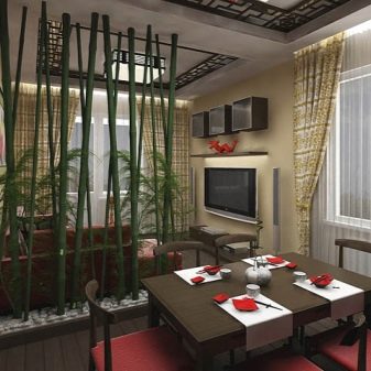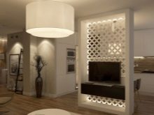 - Příčky. Jeden z nejzjevnějších triků. Velmi často se používá, pokud je obývací pokoj kombinován s kuchyní. Oddíly nemusí úplně oddělit jednu zónu od druhé, ale pouze označují toto oddělení. Například můžete nainstalovat malý oddíl pouze u jedné zdi. Současně bude zachována jednota prostoru. Za stejným účelem se často vyrábějí průhledné, proutěné nebo jiné oddíly, které se nepodobají prázdné zdi.