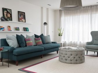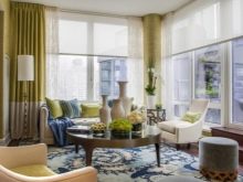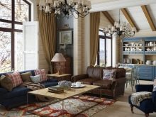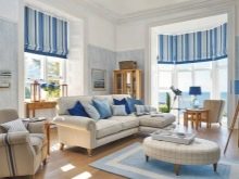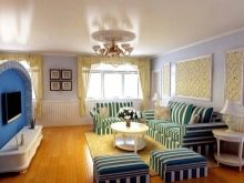 - Středomoří Interiéry v tomto stylu se vyznačují lehkostí a vyrovnaností. Zdá se, že oceán stříká z okna a záclony fouká lehký vánek. Není snadné dosáhnout takového efektu v metropoli, ale je to docela možné. Upřednostňujte monochromatickou výzdobu stěn obývacího pokoje, přidejte do oken světlý textil, vyberte vhodný nábytek a nezapomeňte na jasné akcenty v barvách v blízkosti odstínů moře.