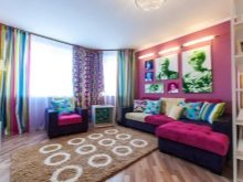- Světlé obývací pokoje. Vytvářím projekt obývacího pokoje v obyčejném panelovém domě, chci mu dát jas a jedinečnost, protože typické budovy se neliší svým zvláštním designem a rozmanitostí tvarů. Ale nikdo vám nebrání ve vytváření zvláštní atmosféry uvnitř. Pro tento účel se nejlépe hodí nasycené veselé barvy téměř jakéhokoli barevného schématu.