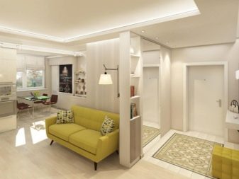 - Vstupní hala. Obývací pokoj může někdy začít okamžitě od předních dveří. V obvyklém uspořádání předchází chodba nebo chodba. Toto řešení umožňuje rozdělit data zóny, ale to není vždy nutné. Majitelé spojením obývacího pokoje a chodby zvětšují využitelnou plochu.