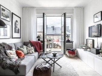 - S balkonem. Pokud má místnost dveře na balkon, budete muset položit nábytek podél zbývajících tří stěn. Za prvé, v typických bytech jsou dveře na balkon kombinovány s oknem, což znamená, že zabírá celou zeď. Za druhé, je obtížné umístit pohovku nebo židli přímo vedle dveří, od té doby bude nevhodné jít na balkon.
