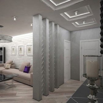 - Sloupce. Velmi zajímavý a neobvyklý způsob zónování místnosti. A pokud si myslíte, že sloupce mohou být pouze ve formě velkých polokruhových objektů se štukovou a svícen, pak se mýlíte. Mohou být provedeny téměř v jakémkoli stylu, stačí ukázat představivost.