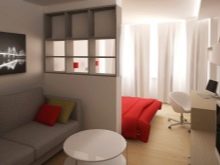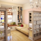 - Nábytek. Pohovka, regály - to je hlavní nábytek, který pomáhá odlišit sektory místnosti. Pohovka uprostřed malého obývacího pokoje bude vypadat dobře, pouze pokud je obývací pokoj kombinován s kuchyní nebo pokud je samotná pohovka miniaturní. Regály jsou snazší - jsou od začátku do konce, malé, ne masivní.