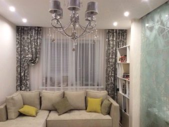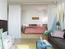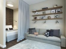 - Záclony. Látky a závěsy přízí jsou další oblíbenou možností rozdělení prostoru. V malém obývacím pokoji by měli mít přesný zásah v barvě, nikoli kontrastní, ale spojující se s pozadím. Vláknové závěsy mohou oddělit jednu zónu od druhé kontinuální přepážkou. Látkové závěsy - může to být dobře těsný, hustý materiál, který je bezpečně připevněn ve dvou držácích (horní a dolní).