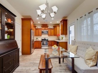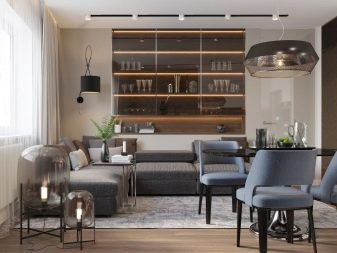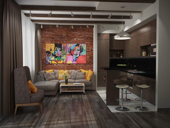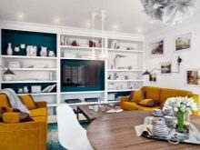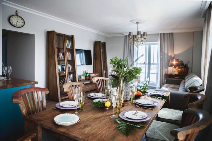 - Něco mezi skandální a fúze, pro podlouhlý obývací pokoj je velmi dobrá volba. Jídelna je krásně zbita, barevné rollouts jsou také úspěšné, odkaz na retro dělá prostor útulným a živým.