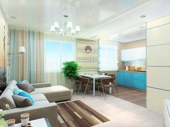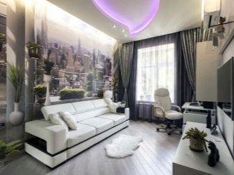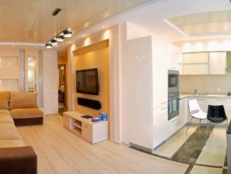 - Strop. Propracovaný strop je kontroverzním řešením pro malý obývací pokoj. Stále však dochází k rozdělení zón různými konstrukčními částmi povrchu stropu. Kompromisním řešením je instalace reflektorů na jednu ze zón (například jídelna).