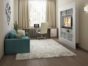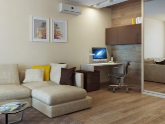- Pokud je v obývacím pokoji písmeno G, které se často děje v „odnushki“, spací část je obvykle v rohu. Pokud ale tento cíl není a místo spánku se shoduje s pohovkou, pak v koutě můžete nastavit plochu uspořádáním mini-kanceláře.