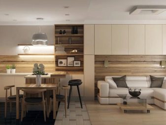 - Tapety. Nástěnná dekorace může také znamenat rozdělení prostoru na zóny. To se používá zejména při vizuálním oddělení rekreační oblasti od jídelny.