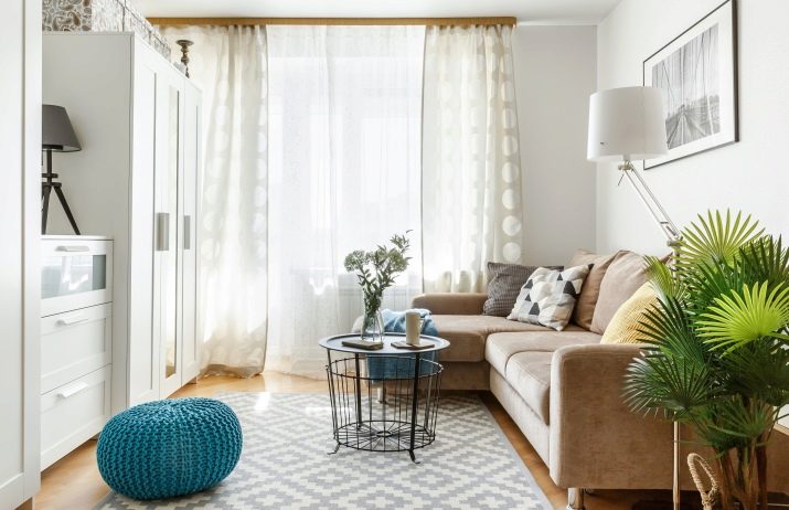 Existují dva rovnocenné přístupy. Prvním je použití všech dostupných nástrojů k vizuálnímu rozšíření prostoru. Barva, tvary, textury, nábytek, výzdoba a textilie - vše je vybráno tak, aby interiér malého obývacího pokoje nezpůsobil žádné připoutání k velikosti, takže se vizuální prostor zdá větší.
