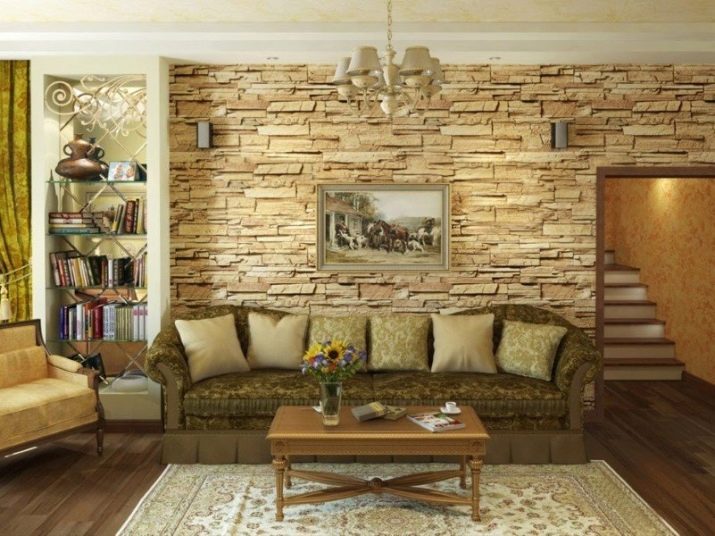 Obaly, které napodobují cihly nebo zdivo, v zásadě vypadají zajímavě v obývacím pokoji, zušlechťují je. Stěny mohou být vybaveny zrcadly nebo lesklými prvky, někdy jsou dokonale doplněny bodovými světly. Pokud se na přímo umístěné centrální stěně nacházejí fotografické tapety s perspektivním obrázkem nebo zajímavé 3D tapety, místnost se také vizuálně rozšíří.