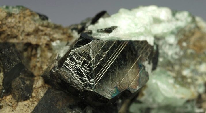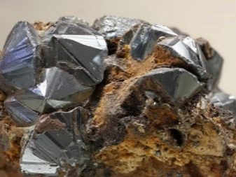Šedé krystaly mají kovový lesk, jsou známé jako železná ruda, tenké šupinaté typy se nazývají slída hematit.