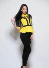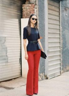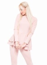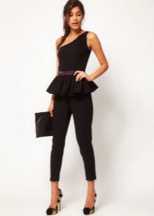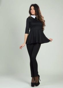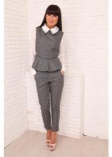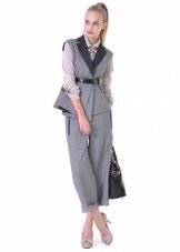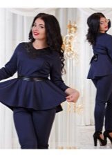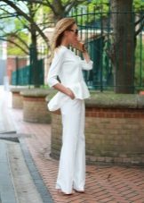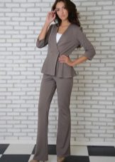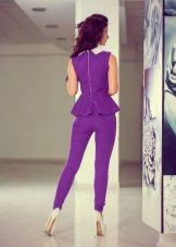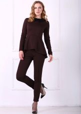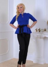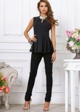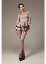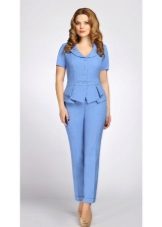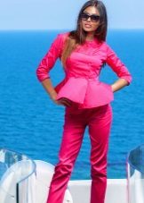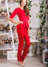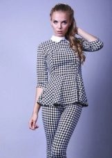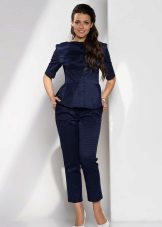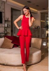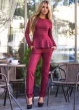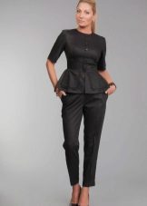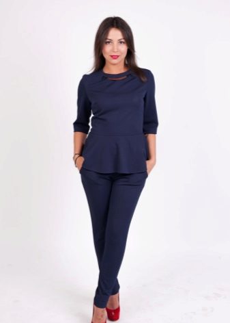 Peplum pantsuit (francouzský styl) dělá ženu elegantnější a sofistikovanější. Látka je zpravidla šita na úrovni boků. To vám umožní vizuálně vytvořit krásnou siluetu připomínající přesýpací hodiny. Tyto styly jsou relevantní pro křehkou postavu - límec vytváří vzhled svěžích boků. Ale dívčí uniformy musí také věnovat pozornost takovému kalhotovému obleku: navíc, čím nižší je baskičtina, tím větší je příležitost skrýt nadměrné objemy. Malé triky, jako je asymetrický střih bundy, jasný povrch švů a masivní knoflíky, tomu také pomohou.