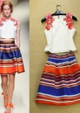 Sukně kostýmu může být vyrobena ze stejného materiálu jako svršek, a přizpůsobte je barevně. Ale sady, v nichž je například spodní část zdobena potiskem, který se odráží v barvě saka nebo bundy, vypadají originálněji. Také sukně jsou někdy šity z méně hustého materiálu, než je horní část oblečení.