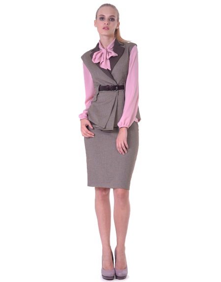 Sukní oblek s vestou může být samostatným kusem oblečeníkterý perfektně zapadá do obchodního stylu. Univerzálním řešením je zkrácená vesta jednoduchého stylu s hlubokým trojúhelníkovým výstřihem, která je ženskou kopií mužského modelu. S touto sadou, která je vhodná pro mnoho ženských postav, můžete vytvořit spoustu elegantních obrázků.