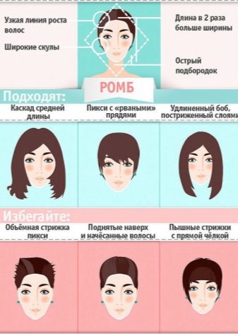 Ženy s kosočtvercovou tváří musí vzít v úvahu důležité pravidlo: dát jim správné proporce a krása vždy pomůže kadeře. Můžete vytvořit svěží vlny nebo malé kadeře, které zjemní rysy obličeje a vizuálně zvětší bradu. Pokud jsou vlasy rovné, měl by se u kořenů vytvořit objem a šikmo rozdělit. Kadeře by měly pokrývat lícní kosti. Ideálními možnostmi pro rovné vlasy jsou vrstvení, stupňové srážky.