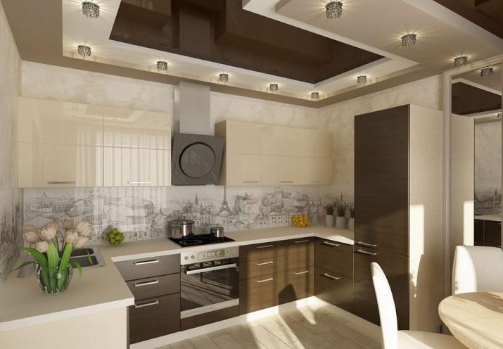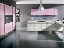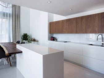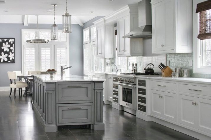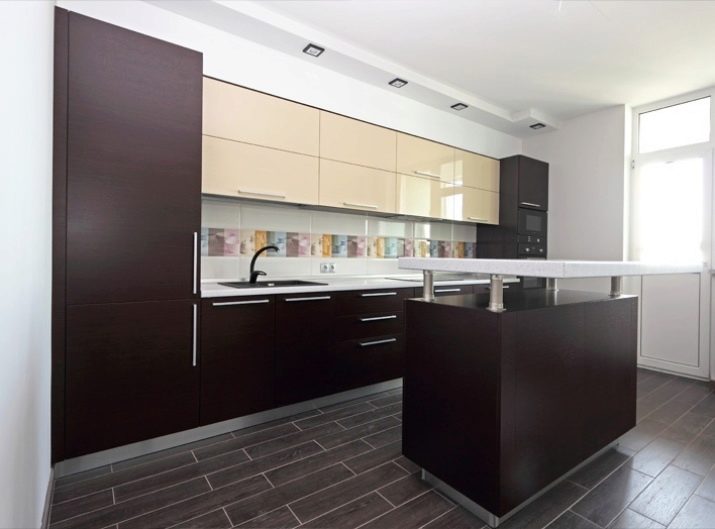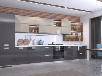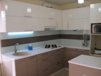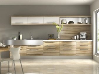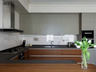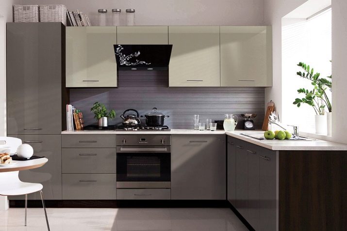 Takový nábytek dnes vypadá obzvláště drahý v kuchyni. K dosažení požadovaného účinku však musíte věnovat pozornost čistotě tónů a jejich teplotě. Můžete si vybrat model se šedým dnem a béžovým topem, který zvětší prostor. Pokud chcete demonstrovat jedinečnost náhlavní soupravy odlišně, můžete se podívat na možnosti, kde lze kontrastní skříňky a závěsné zásuvky kombinovat do jedné skupiny tak, že je umístíte například do středu náhlavní soupravy modelu.