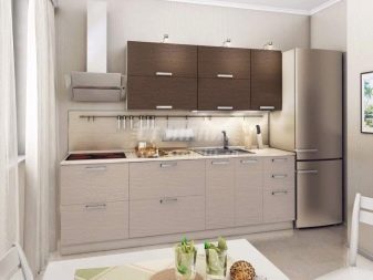 Dnes je v módě vybírat modely s tmavým dnem a světlým vrcholem. To vám umožní vizuálně vymazat tuhé hranice stěn, rozšířit prostor a zvýšit strop. Příkladem dokonalé kombinace je kontrast bílé s grafitem. Neméně úspěšně vypadá v interiéru kuchyně sada, jejíž podlahové skříňky jsou hnědé a závěsné zásuvky - béžové. Vizuální efekt je podobný, ale použití barevných odstínů vytváří v kuchyni jinou atmosféru.