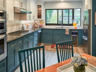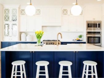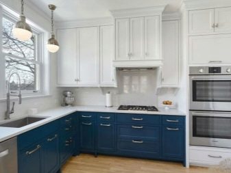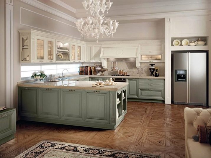 Dvě různá barevná náhlavní souprava klasické není nic jiného než výběr podle principu vážnosti paláce. Jedná se například o bílé pozadí a zlacení, mléčnou střechu a šedo-tyrkysové dno.Zajímavým řešením by bylo vytvoření akcentní zóny uprostřed kuchyně pomocí barvy akcentu. Řekněme, že může být zvýrazněna jednou barvou a veškerý zbytek nábytku může být vybrán v jiné. Takový design v interiéru klasické kuchyně bude vypadat více než vhodný a harmonický.