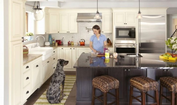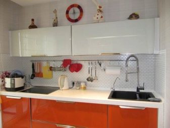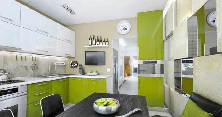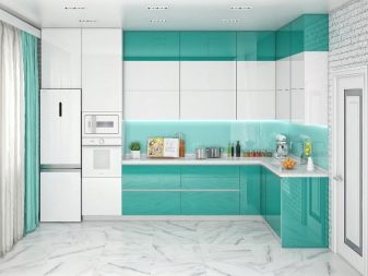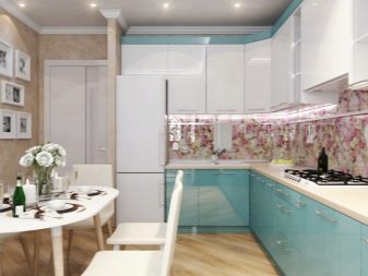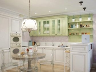 Pro vybavení kuchyně není vůbec nutné kupovat sluchátka s výrazným kontrastem. Například můžete vsadit na bílý duet s jakýmkoli odstínem barevné palety. Je neutrální a obzvláště úspěšně kombinován se světlými tóny (například s pistácími, šedo-růžovými, šeříkovými, máty, bělavě tyrkysovými, karamelem, limetkou, citronem).