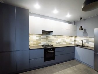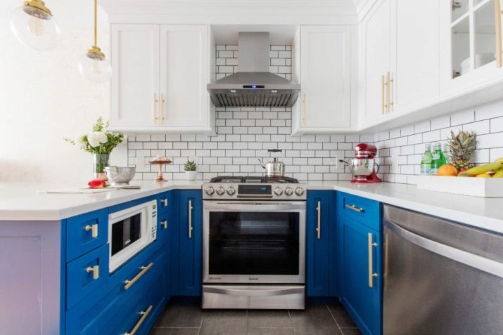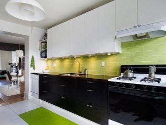 - Příklad kuchyňského zónování pomocí barevné náhlavní soupravy, stylové verze interiéru.