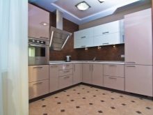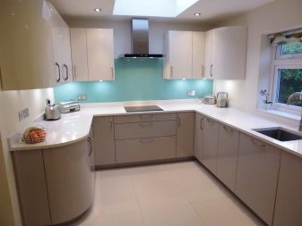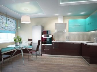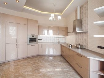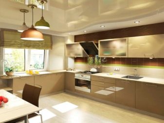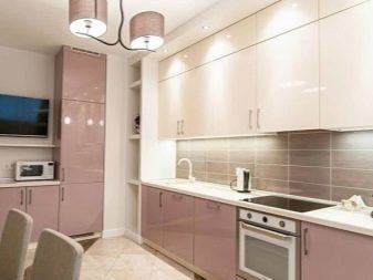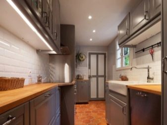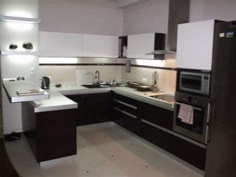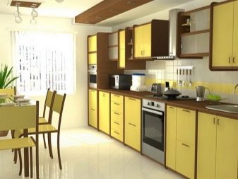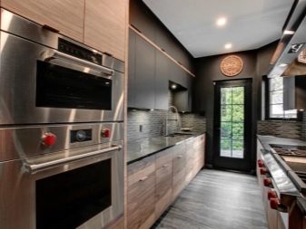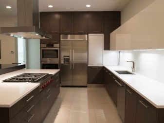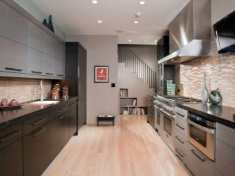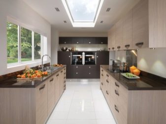 Toto je zajímavé řešení, ve kterém je headset umístěn podél dvou protilehlých stěn. Můžete distribuovat domácí spotřebiče, pokud existuje pódium, oddělte jídelní kout kvůli rozdílu ve výšce. Tato možnost je nejlépe implementována v prostorné kuchyni.