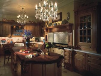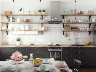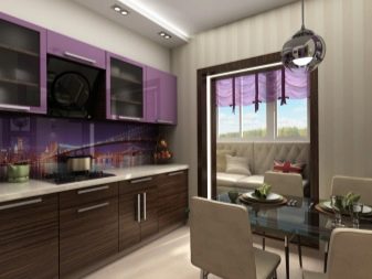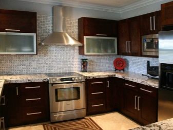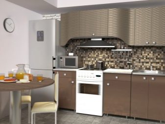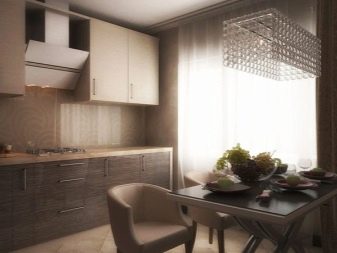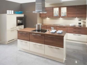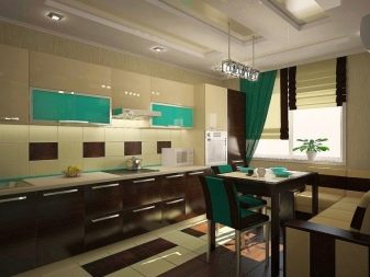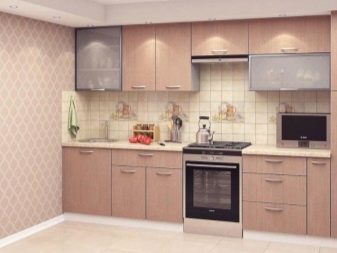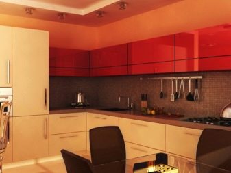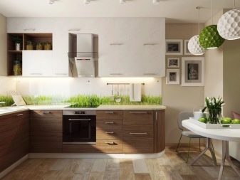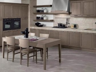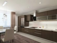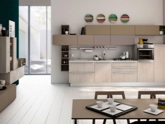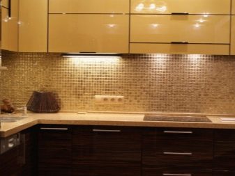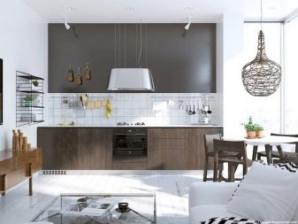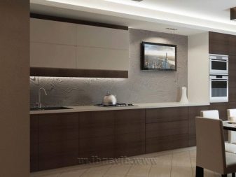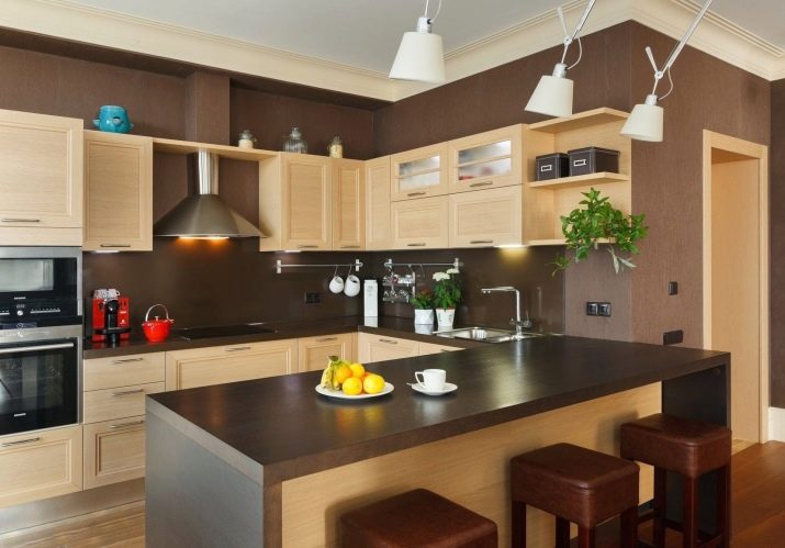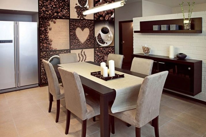 Pokud místnost slouží také jako jídelna nebo obývací pokoj, je lepší vyzdobit stěny textilními nebo hustými texturami a malovat. Zástěra by měla být ozdobena luxusním panelem s fototiskem nebo jako dekorační prvek použít keramické dlaždice čokoládově hnědé, mléčné, krémové odstíny.