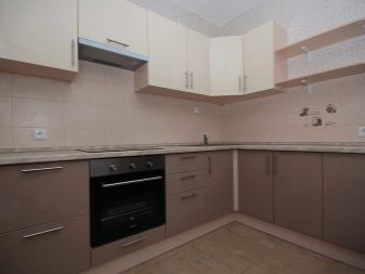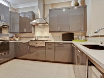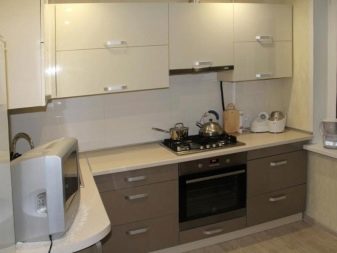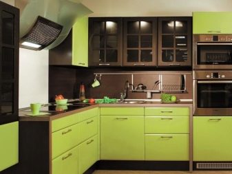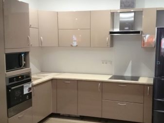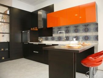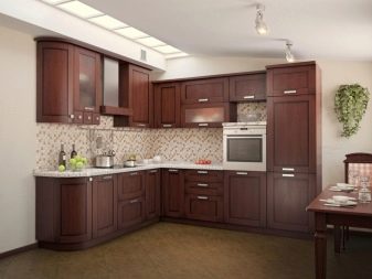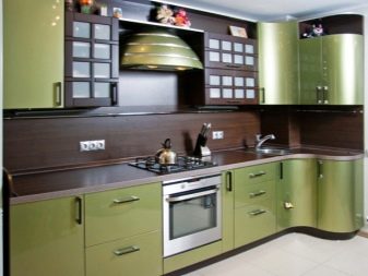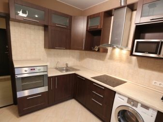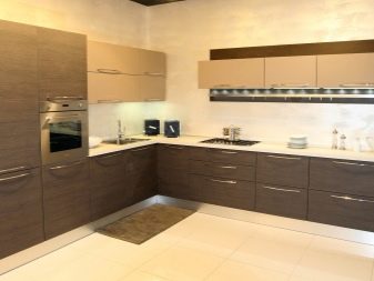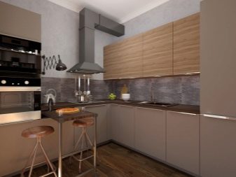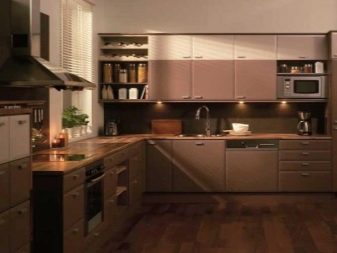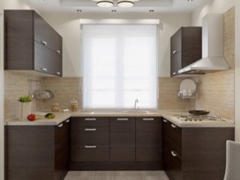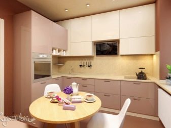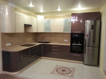 Nejoblíbenější možnost. V barvách kávy se obvykle vyrábí s měkkými zaoblenými rohy. Ve čtvercové kuchyni se pokračování rohového modulu obvykle stává počítadlem barů umístěným podél okenního otvoru.
