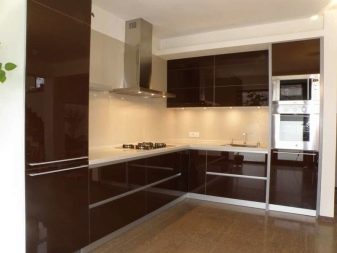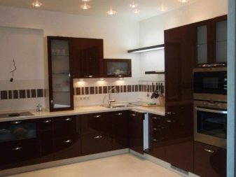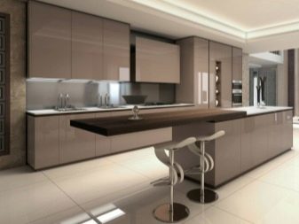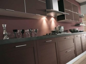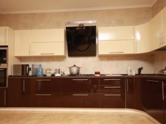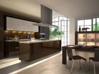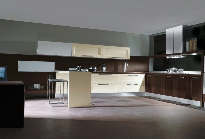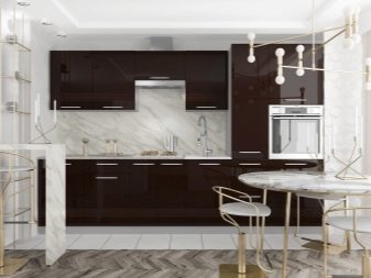 Při výběru barvy kávy pro zdobení kuchyně byste měli věnovat pozornost skutečnosti, že pro dekoraci fasád musíte v každém případě zvolit lesk. Matný povrch v tomto případě může zjednodušit hluboký komplexní tón, učinit ho rovným a nezajímavým. Je lepší zvolit si pevnou pracovní desku, pokud používáte dvě barvy, je vyrobena tak, aby odpovídala horní řadě skříní. To pomáhá vyvážit zvolené konstrukční rozhodnutí.