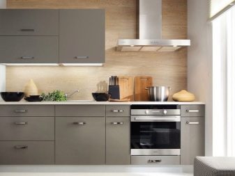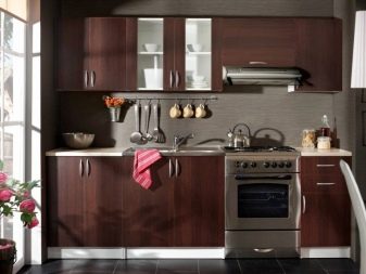 Sada v jedné řadě se hodí i do malé kuchyně a nedostatek úložného prostoru může být kompenzován klasickým skříňkovým pouzdrem v rohu. Barva kávy je lepší použít v celé náhlavní soupravě, s výjimkou desky. Ve skandinávském stylu můžete horní řadu skříní nahradit policemi nebo policemi.