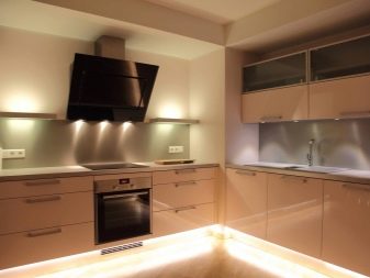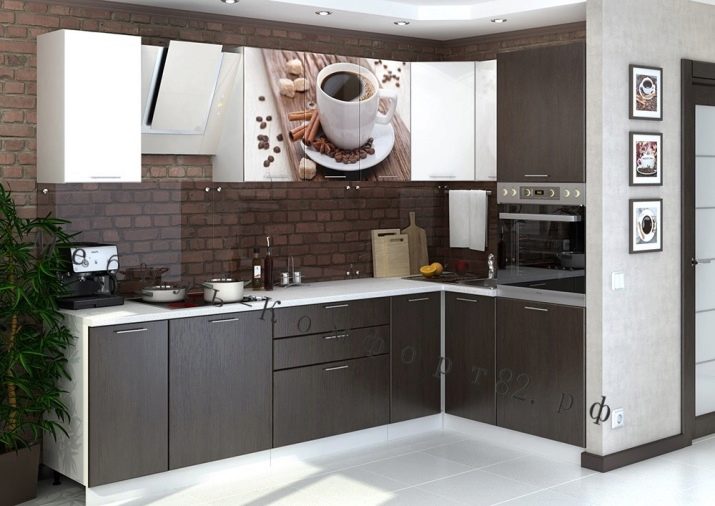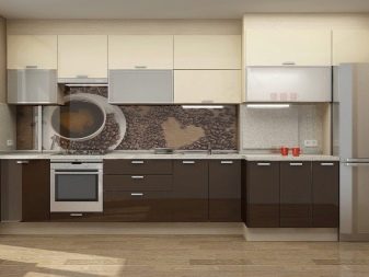 Živý příklad moderní kuchyně ve stínu cappuccina s černým pozadím a zástěra s fotografickým tiskem. V těchto interiérech se často používají obrazy kávových zrn, které zvyšují kontrast dekoru. Zde se tato technika používá také při výzdobě fasád nástěnných skříní.