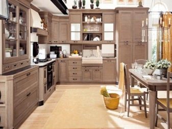 Moderní řešení, které umožňuje nejracionálnější využití celé oblasti místnosti. Taková sada je umístěna podél tří stěn místnosti nebo v rohovém provedení s barovým pultem na straně.