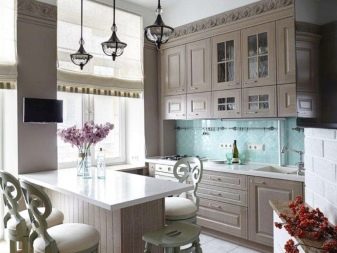Stejně jako jiné country styly, to vám umožní použít pastelově-béžové odstíny mléka bělené kávy ve výzdobě kuchyně. Zde je lepší použít ne obyčejné skříňky, ale možnosti s kontrastním lemováním nebo vložkami panelů na fasádách. Takové řešení vypadá dobře s růžovými a broskvovými, tyrkysovými květy máty. Ve stylu Provence může mít pracovní deska jeden tón s fasádami a je přijatelná zcela monochromatická kuchyně.