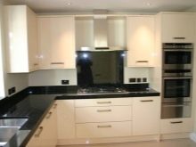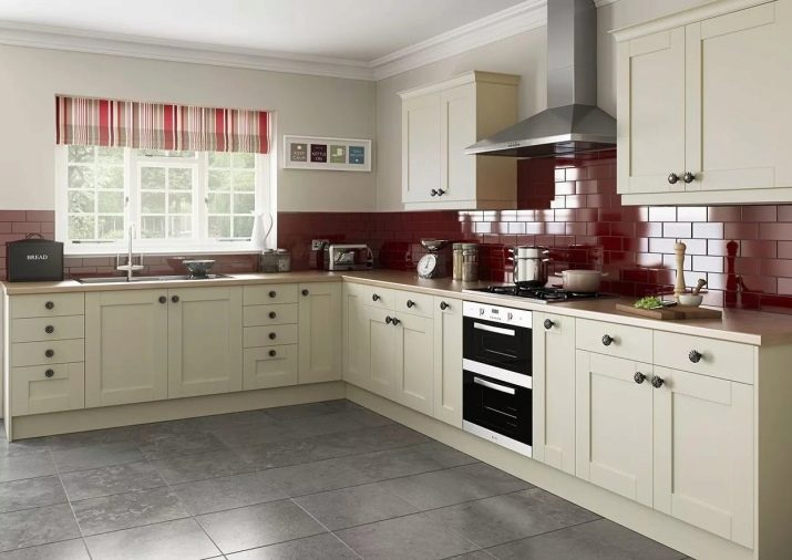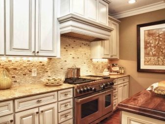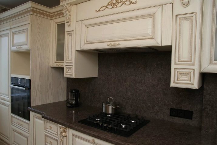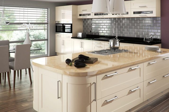 U kuchyně se slonovinou je nejlepší zvážit skleněnou kamennou zástěru. Ideálně, když ozdoba, barva nebo vzor zástěry odráží detaily interiéru.
