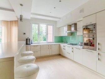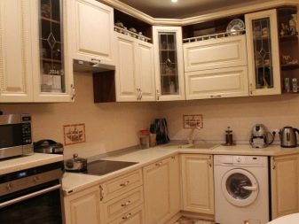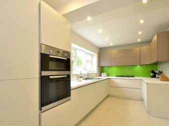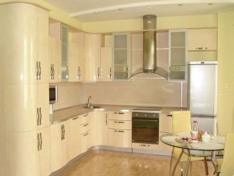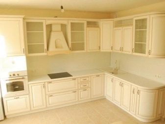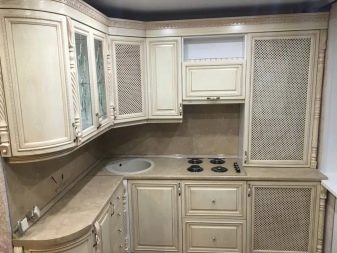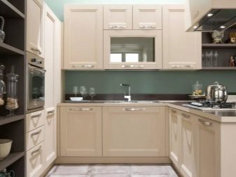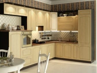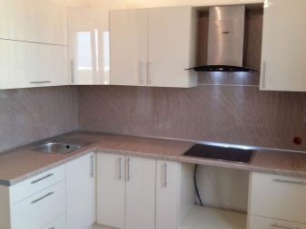 Řezy jsou uspořádány podél dvou stěn ve tvaru L. Velmi oblíbená možnost, ideální pro čtvercové pokoje. Tyto náhlavní soupravy jsou prostorné, funkční, vypadají stylově a esteticky. Práce v takové kuchyni je velmi pohodlná, protože vše je po ruce.