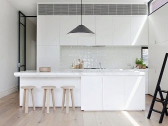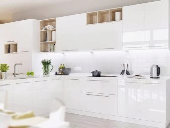 Světlý rozsah v designu kuchyně je velmi žádaný díky mnoha vynikajícím kvalitám. Například takové odstíny vytvářejí dojem velké, prostorné místnosti, dávají slavnostní náladu, snižují úzkost a relaxují. Současně není vroucí bílý odstín tím nejlepším řešením pro hlavní pozadí návrhu, protože vytváří iluzi sterilní nepříjemné místnosti. Kromě toho je bílá jedna z nejpraktičtějších. Čistota v takové kuchyni bude muset být pečlivě sledována.