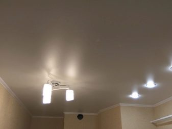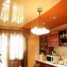 - Saténový strop typ napětí kombinuje vlastnosti výše uvedených typů. Má pouze malý lesk na povlaku, který je schopen odrážet světlo. To stačí k mírnému vizuálnímu rozšíření prostoru v kuchyni. Je pozoruhodné, že péče o tyto struktury je velmi snadná, i když jde o jejich čištění od zbytků sazí. Nezapomeňte však, že na tento materiál se nevztahuje fotografický tisk a paleta barev pro jeho design není tak široká jako u jiných odrůd.
