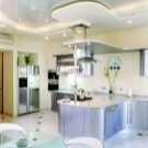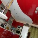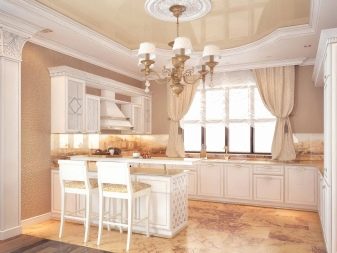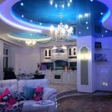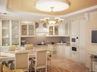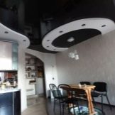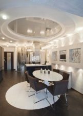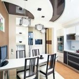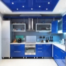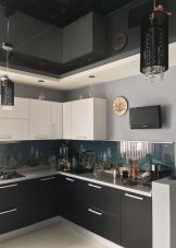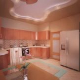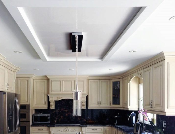- Instalace matný dvouúrovňový strop v klasickém stylu, dodržovat symetrii v jeho podobách. Pokud dáváte přednost moderní kuchyni, můžete experimentovat s siluety nižší úrovně.
