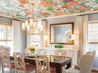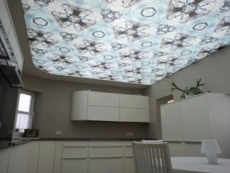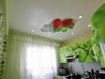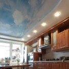 - Stropní povlaky napínaného typu s fotografickým tiskem Vhodné pro prostorné pokoje nebo pro pokoje kombinované s obývacím pokojem. Fotografický tisk se aplikuje na původní vrstvu na jednotlivém projektu. Může to být jakýkoli druh ornamentu, krajiny, zvířat a mnoha dalších možností, takže strop v kuchyni se stane skutečně jedinečným. Také taková dekorace povlaku může být roztříštěna a určovat rozměry celého plátna nebo koncept interiéru.