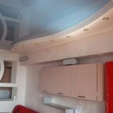 - Pokud uděláte spodní vrstvu strečového stropu vlnou podle obrysu kuchyňské sady, pak by měla být vytvořena pomocí malých svítidel zabudovaného typu uspořádaných v řadě. To nejen přidá světlo do pracovní oblasti náhlavní soupravy, ale také to zvýrazní jako samostatnou kuchyňskou část.