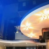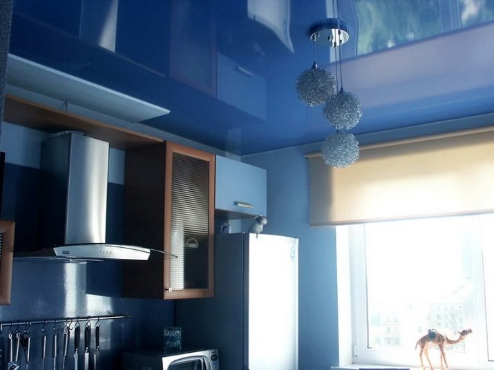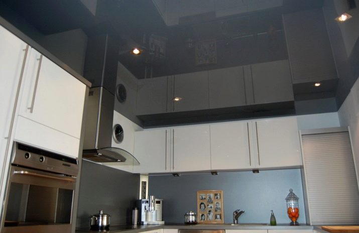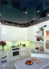 - Fanoušci moderních konceptů často volí design napínaného stropu v kuchyni v tmavých barvách. Tyto odstíny zahrnují černou, tmavě modrou nebo fialovou. Aby bylo možné vyrovnat šero, které určitě vytvoří takový povlak, je nutné správně nainstalovat osvětlení. V tomto případě je žádoucí, aby přirozené světlo také proniklo do takové místnosti ve velkém množství.