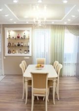 - Pomocí tříúrovňového stropu můžete vytvořit půlkruhovou siluetu nátěru, která v něm spojí bohaté práškové a bílé barvy. Dodatečnou výhodou bude také harmonie světlé části stropu s kuchyňským textilem.