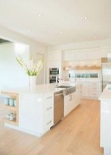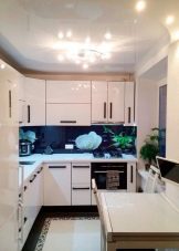 - Světlé barvy jako bílá, béžová, mléko vypadají skvěle na lesklých vzorech. Umožňují nejen vizuálně zvětšit prostor v kuchyni, ale také odrážejí více světla v malých místnostech.