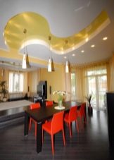 - Z barevných řešení je také třeba zdůraznit dvoubarevný soubor pro víceúrovňové vzory. Úroveň, která zabírá většinu stropu, může být světlejší, zatímco spodní z nich je natřena jasným tónem, například červenou, žlutou, oranžovou nebo růžovou. Pamatujte však, že množství takové intenzivní barvy by nemělo být příliš velké.