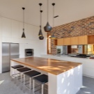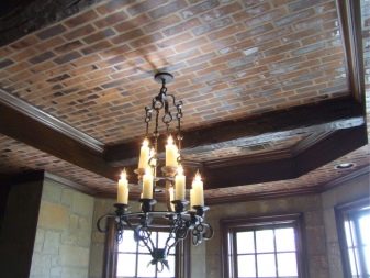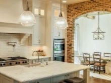 Kuchyň s ozdobným zdivem nemusí mít zdi tímto způsobem zdobené - většinu druhů dekorativních cihel lze použít na stropní povrchy, ale podléhají vysokým stropům nebo použití světelné palety, která vizuálně nezpůsobí příliš nízkou místnost.
