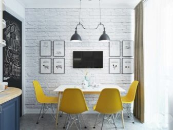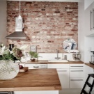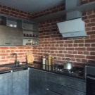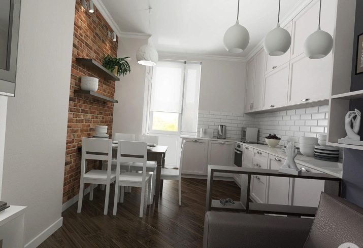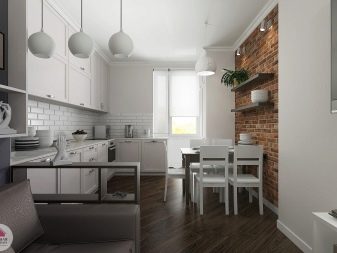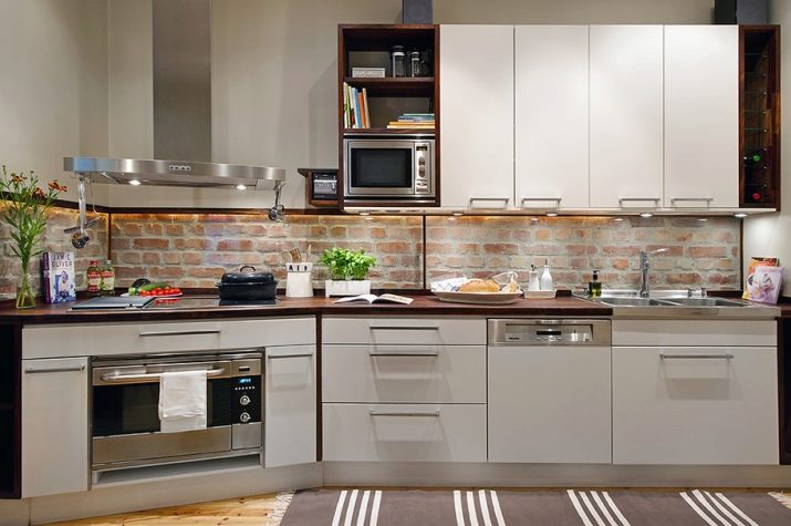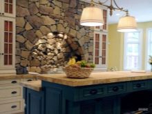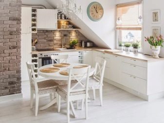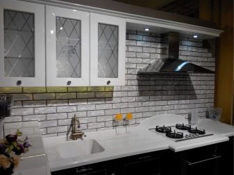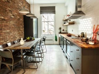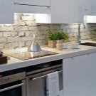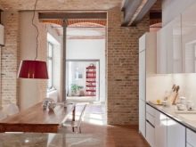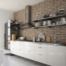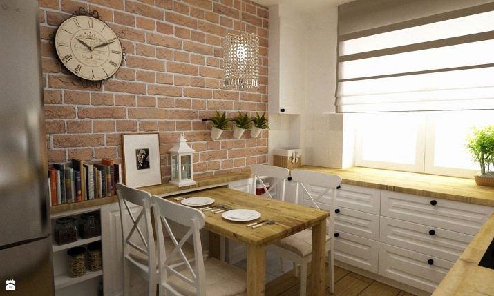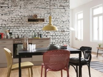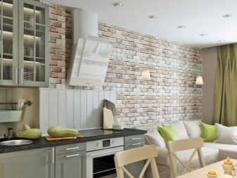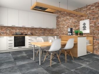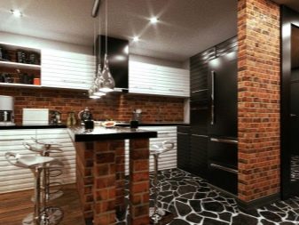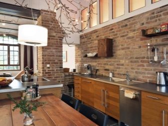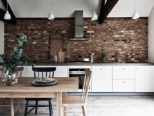 Zajímavou technikou je uspořádání akcentů v interiéru: napodobení zdiva může být přítomno v kuchyňském pracovním prostoru na zástěře nebo ve variantách, když taková dekorace pokrývá celou zeď v jídelně. To umožní správně implementovat funkční zónování kuchyňského prostoru.