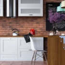- Dobrým řešením pro příliš velkou místnost bude použití kontrastní spárovací hmoty a lehkých produktů napodobujících cihly. Realizace takového nápadu zlepší atmosféru v kuchyni pohodlnější, zatímco cihlové zdi nebudou vypadat prázdné.