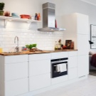 - Pro zdůraznění prostornosti a hygieny místnosti je možné pro styling použít přesně bílé materiály. Takové výrobky budou v dokonalé harmonii s přírodními povrchy, které jsou často v kuchyni. Může to být dřevo, kovové desky, ozdobné prvky, nábytek vyrobený z plastu nebo textilních výrobků.