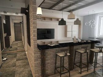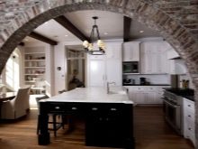 Nápad, který je relevantní při kombinaci kuchyně s balkonem, obývacího pokoje a dokonce i chodby. Tváří v tvář existujícím obloukům nebo zbytkům zdi promění standardní interiér místnosti v kreativní design.