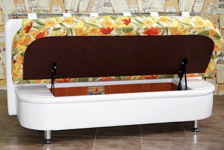 Většina lidí dává přednost přímé pohovce s krabicí pro uložení drobného nádobí: nádobí, ubrusy, nářadí, cereálie, okurky a zavařeniny.